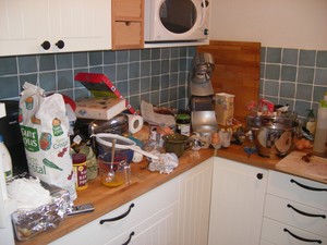Avant de commencer rangez la cuisine complètement : la vaisselle sale au lave-vaisselle (si vous n’avez pas de lave-vaisselle, faites la vaisselle avant de commencer à cuisiner), la vaisselle propre dans les armoires, tout doit être rangé à sa place.