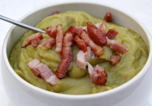- (Si vous avez utilisé de la viande (lard, jambon ou jambonneau) il est temps de la couper en morceau et de l’ajouter à la soupe)